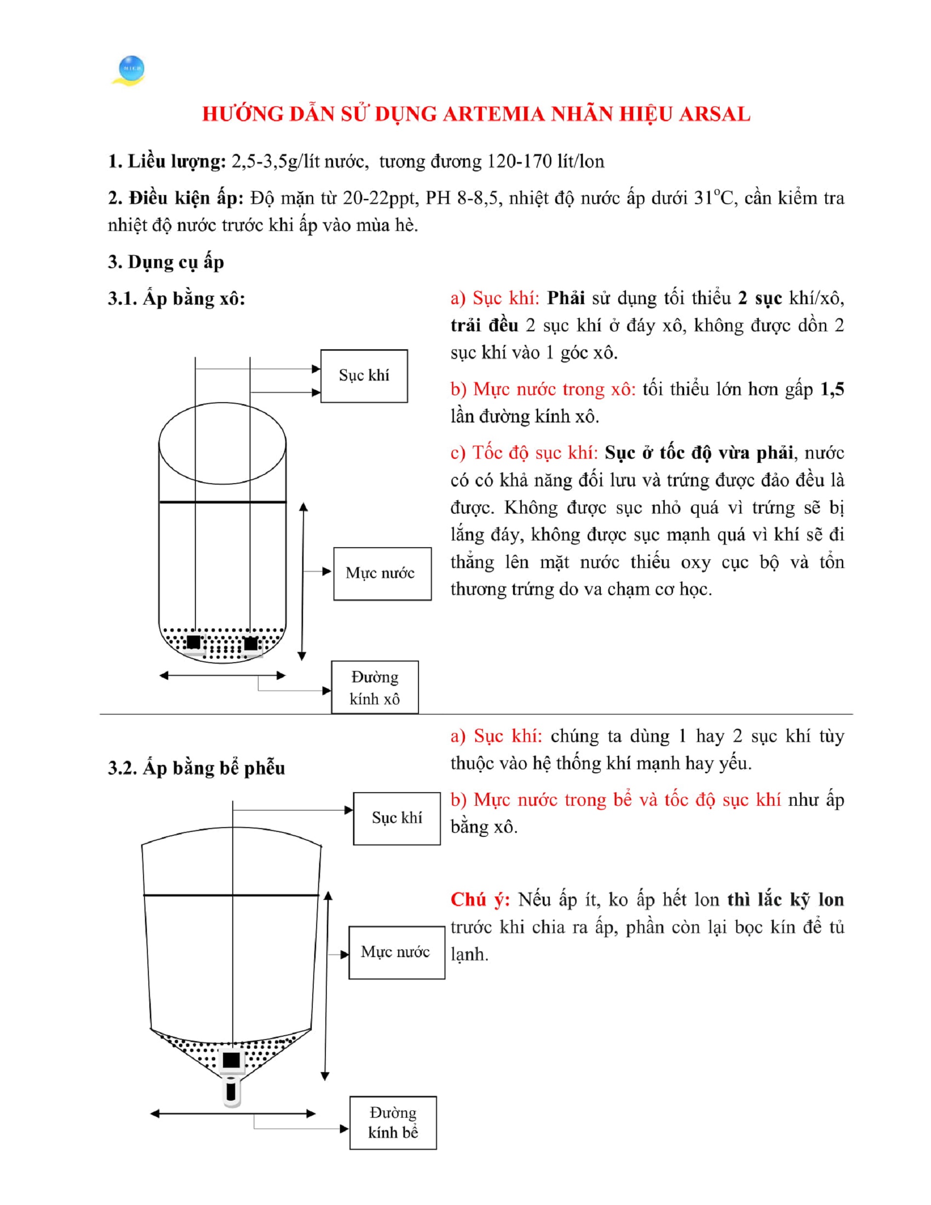 Cách sử dụng: Lắc đều sản phẩm trước khi sử dụng. Không rửa sản phẩm. Dùng dung dịch nước biển xử lý có độ mặn 20-22ppt, pH:8.0-8.5, nhiệt độ 28-30oC. Ấp trứng với tỷ lệ 2,5-3,5g/l dung dịch ấp. Sục khí mạnh, đều từ đáy bể ấp và chiếu sáng liên tục ở mức 1500-2000 lux. Thời gian ấp trong vòng 24 tiếng.